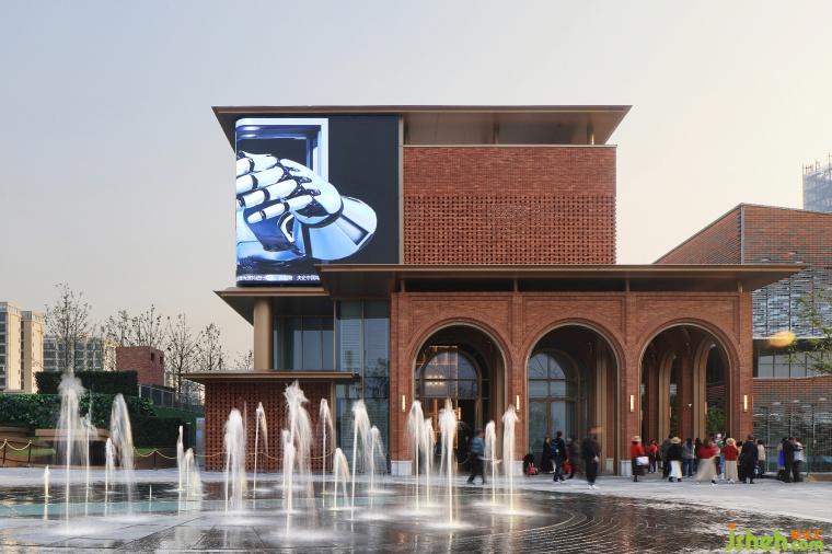街區(qū)中的核心建筑將奠定整個商業(yè)呈現(xiàn)出的氣質(zhì)。因此,售樓部的改造不僅注重美學(xué)上的提升,更強(qiáng)調(diào)將文化屬性注入。西側(cè)的設(shè)計(jì)采用了“寓舊于新”的理念,挖掘城市的歷史印記,以“悅來文化”為引,進(jìn)行了一場關(guān)于傳承與發(fā)展的古今對話。