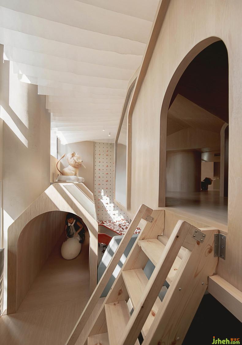 除了有意思的功能分區(qū),生動的動物形象,空間中還有著各種各樣不同的洞口,室內(nèi)設(shè)計師小朋友可以在不同的洞口發(fā)現(xiàn)不一樣夢幻有趣的世界。