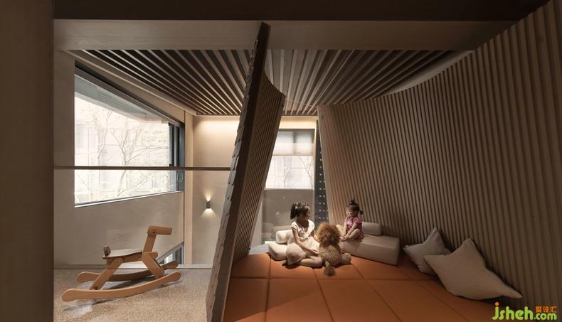 在設計師設計過程調(diào)研中獅子是最受小朋友喜愛的主題IP,因為在媒體中獅子一直是作為勇氣的代名詞,勇氣是敢于去挑戰(zhàn)一切困難。室內(nèi)設計師該主題親子民宿主材主要選擇符合獅子主題特色的材料:米黃色肌理漆及木飾面,且在空間中設置了木屋,秋千,木馬及具有勇氣象征的小型攀巖墻作為 親子互動元素 。家長和小朋友可以在獅子主題民宿中在木屋里講故事,暢想那生動有趣的辛巴王國。