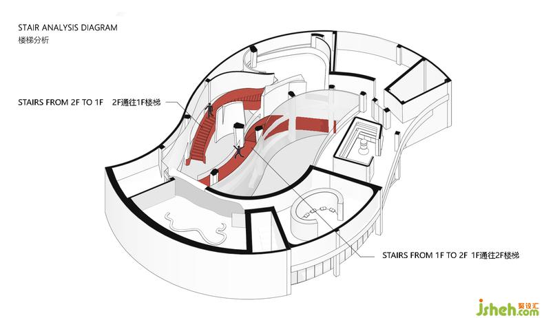 在生命之源性文化展館的整個前廳造型設(shè)計上,設(shè)計團隊通過兩條曲面造型的樓梯貫穿整個前廳,文化展館設(shè)計一條蜿蜒向上,一條順延向下,兩條樓梯于前廳視角中交織在一起,正寓意著兩性中男性與女性角色。他們相互獨立,卻又相互平等,兩者相望。
