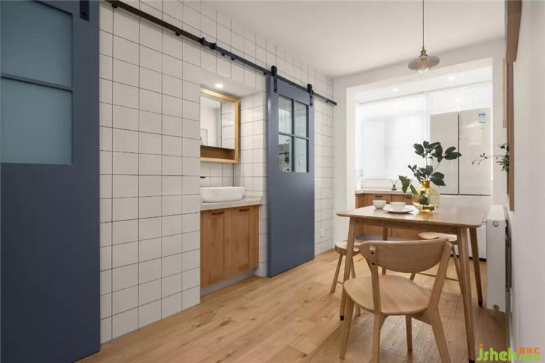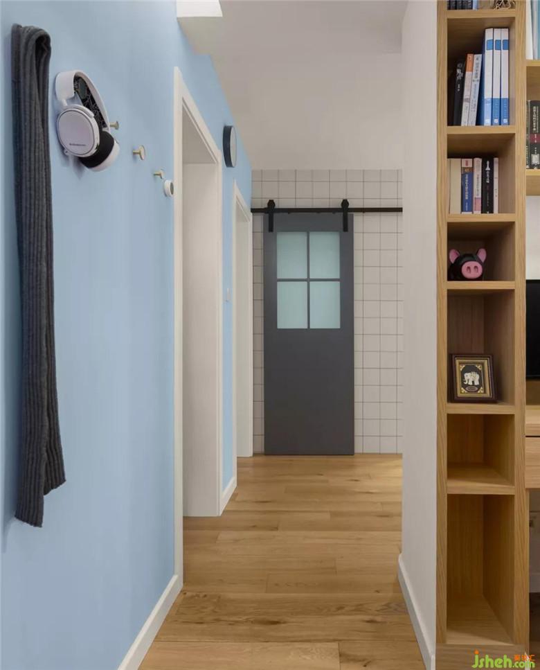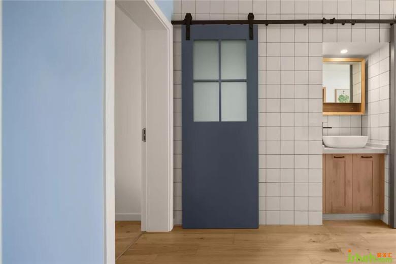 從門廳朝里看是衛(wèi)生間門的谷倉(cāng)門,在現(xiàn)有格局沒(méi)辦法改動(dòng)的情況下就從美觀上來(lái)做調(diào)整,半截玻璃的灰色谷倉(cāng)門進(jìn)門看到的會(huì)是一道風(fēng)景。