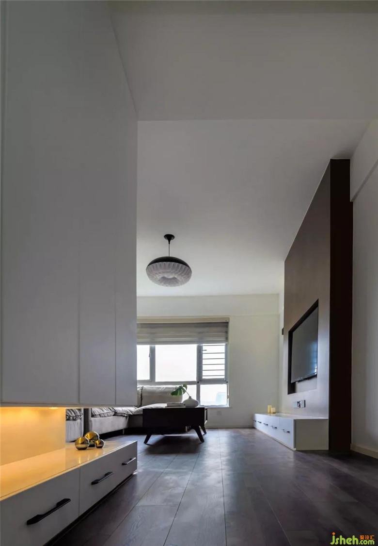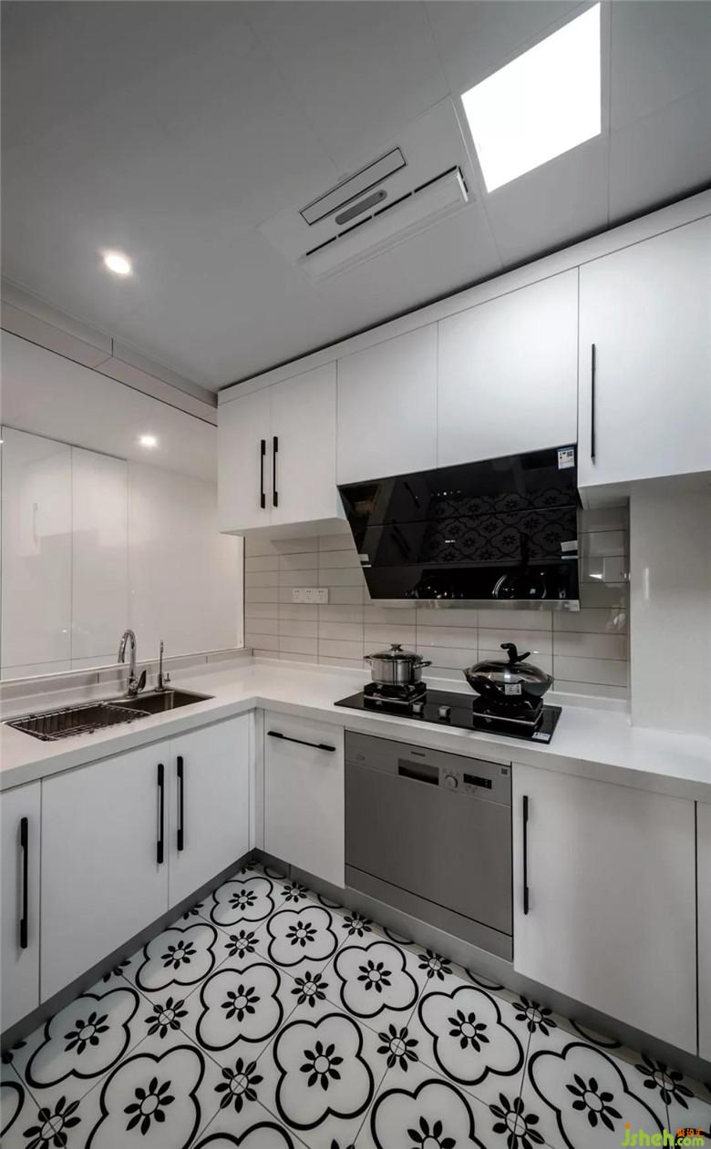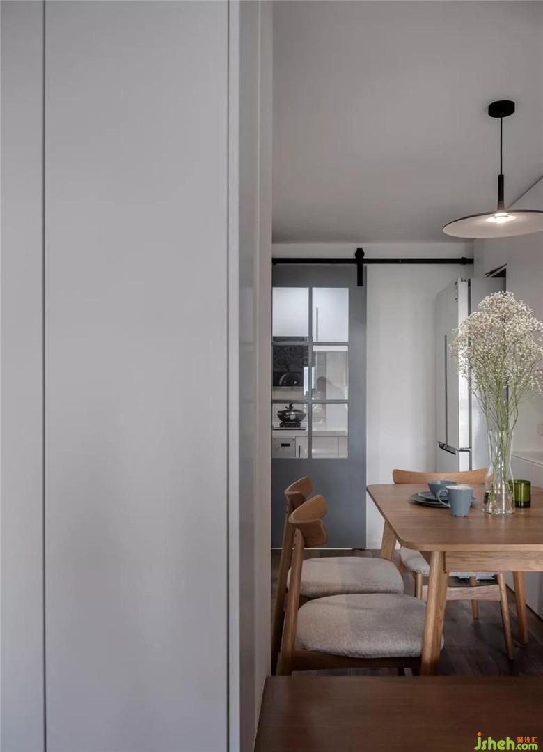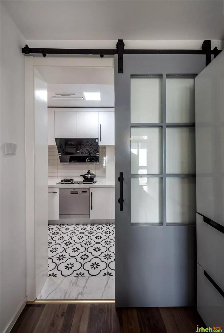由于廚房沒(méi)有自然采光,把廚房靠近過(guò)道的半截墻拆掉做了透明玻璃,這樣可以增加些采光,也可以減少過(guò)道的狹長(zhǎng)和局促感。