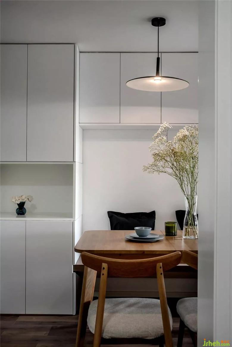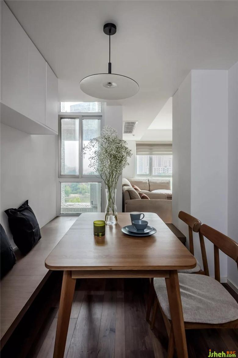 外面接近進(jìn)門(mén)和過(guò)道屬于在動(dòng)線上面,里面呢層高比較低,考慮到冰箱的位置結(jié)合飄窗,在餐廳做了卡座。