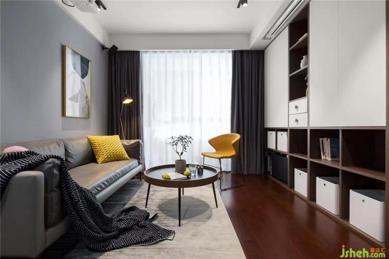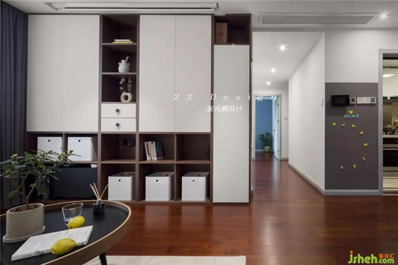 客廳舍棄了傳統(tǒng)電視改成書柜加投影和環(huán)繞音響,針對不同使用需求。書柜下半部分做了開放式用來放置音響設(shè)備及孩子玩具收納。