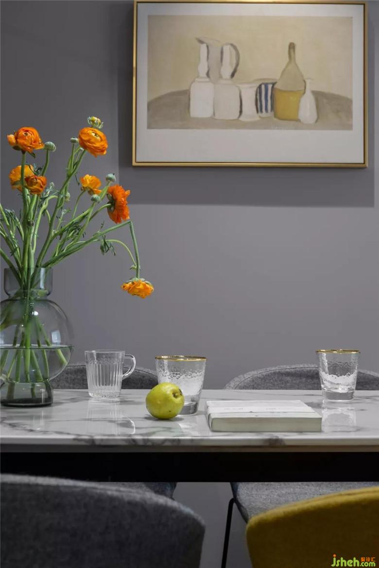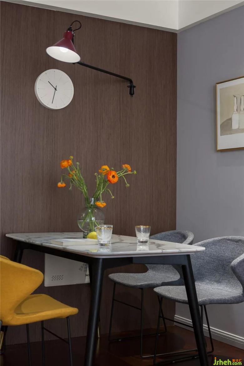 門廳的鞋柜原來豬肝紅的柜門換成了白色,進入門廳后首先就是餐廳,餐廳選用白色爵士白大理石桌面餐桌,墻面整體KD板整潔美觀更好打理,廚房門口的一小塊地方刷的半截磁性黑板漆,可以是孩子的早教板,也可以是家人的留言板。