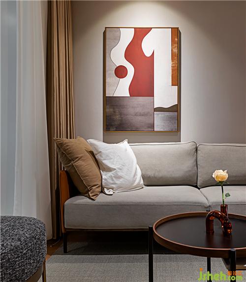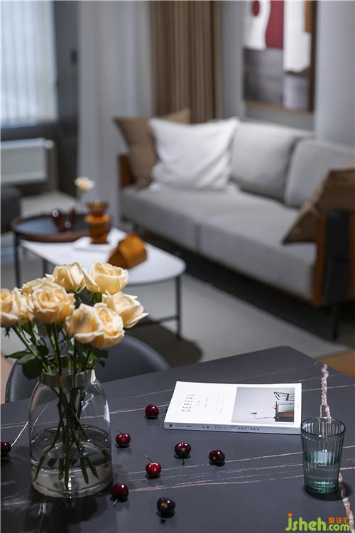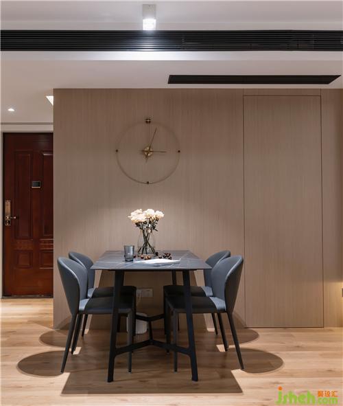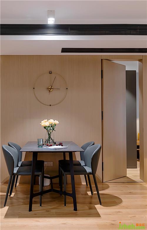 ▲勞倫黑金巖板餐桌,配以灰色真皮餐椅,穩(wěn)重精致。整面的KD板,再內嵌隱形門,保持客廳的整體性和完整度。KD板細膩的紋理,天然成為西班牙鐘的鐘面,不著數(shù)字的表盤,讓人領會時間中的留白南京室內設計師。