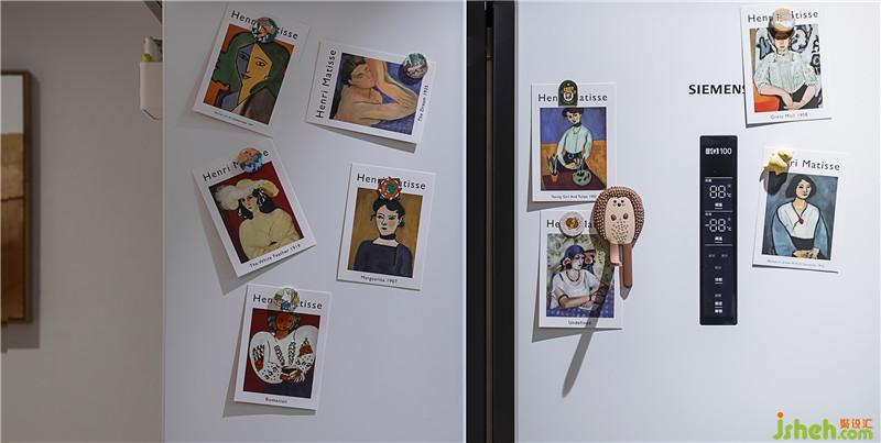 ▲次臥冰箱門上也貼滿了我們從國外帶回來的‘野獸派’的畫作,和設計師找的畫不謀而合,心有靈犀啊,哈哈哈。