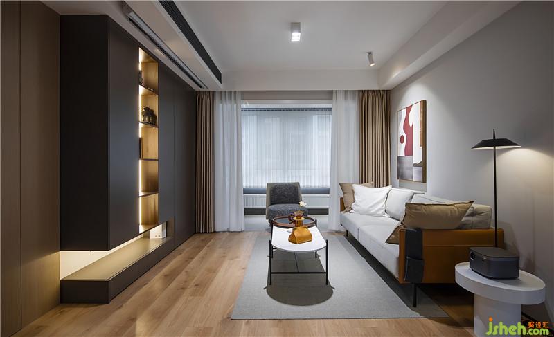 ▲舍棄傳統(tǒng)電視墻,取而代之以幕布和投影實現(xiàn)觀影需求。但更重要的是釋放空間,滿足閱讀和收納的需要。