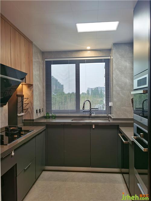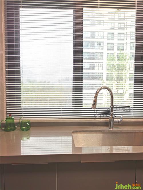 ▲廚房 高柜中內(nèi)嵌蒸箱、烤箱。洗碗機、拉籃各執(zhí)一邊,合理分區(qū)。下沉式臺盆配以抽拉式水龍頭和凈水龍頭。側(cè)吸的油煙機凸顯U型廚房的精致。金屬百葉簾調(diào)節(jié)光線南京室內(nèi)設(shè)計師。以女主人身高量身定做的高低臺,操作便捷,烹飪美食,亦是調(diào)味生活。