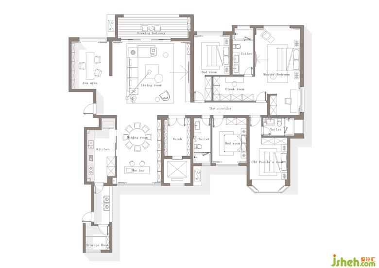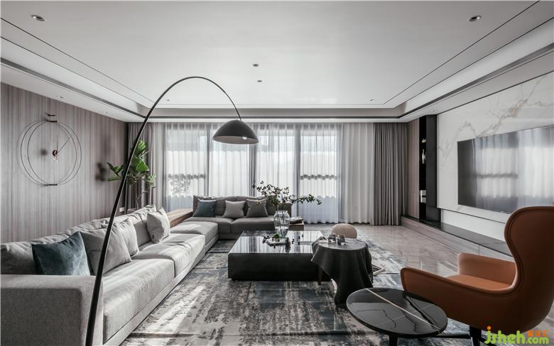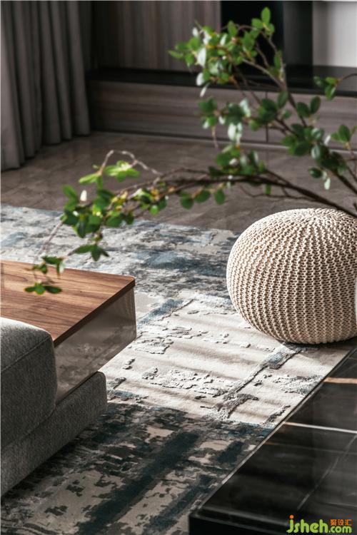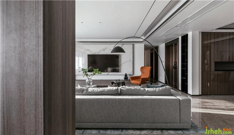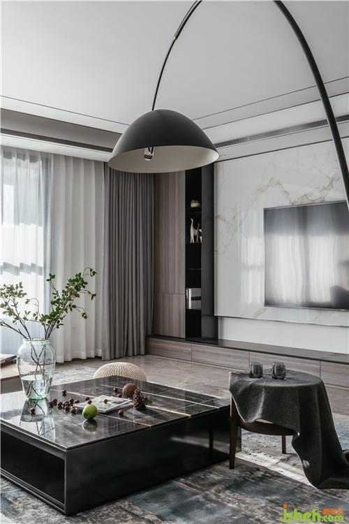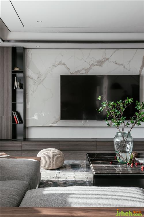 核心:電視背景墻。大板磚落地電視柜、鋼板,保留現(xiàn)代感的靈活分割。