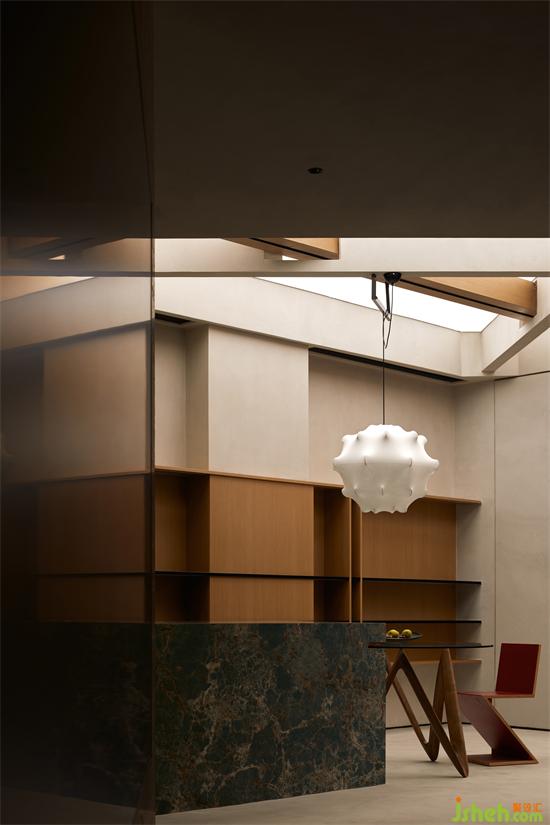餐廳和品茶區(qū)借由粗細、大小、縱橫交錯的“梁結(jié)構(gòu)”體系串聯(lián)于一處,立體的線條有著馬列維奇式的動勢和飛行感,而茶臺區(qū)的立柱通天接地,使不穩(wěn)定的形式有著穩(wěn)定的視覺感受。展廳設(shè)計水平橫向的柜體同長條吧臺由入口處流向空間的內(nèi)部,在天、地、墻整體的基底里活躍出非同尋常的立面情緒。