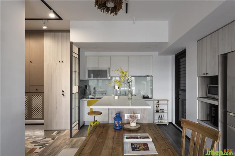 在空間上規(guī)劃了客廳、開方式餐廚房及用餐吧臺,設(shè)有兩間臥室和貓兒的活動空間(跳臺+高處可休憩的地方),隱藏式的儲藏室讓視覺上不會有壓迫感。裝修設(shè)計(jì)