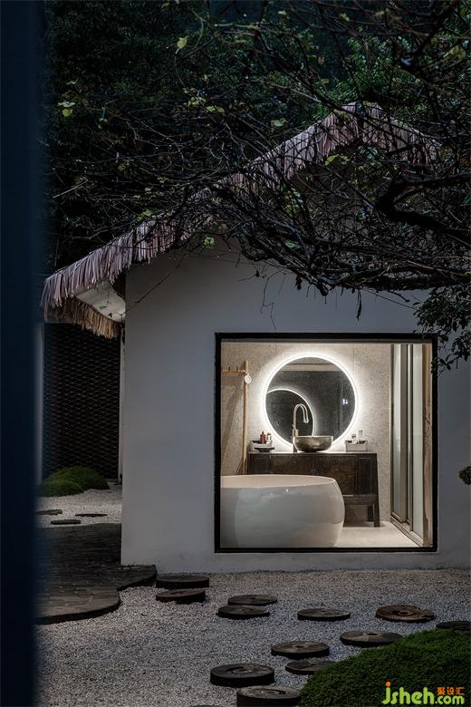 由原豬圈改造的開放式的主衛(wèi),圓形的落地浴缸、圓形的鏡子、特殊設(shè)計(jì)的洗手臺(tái)充滿了浪漫的氣息,舊房改造設(shè)計(jì)在老葡萄樹的映襯下,享受月光浴。