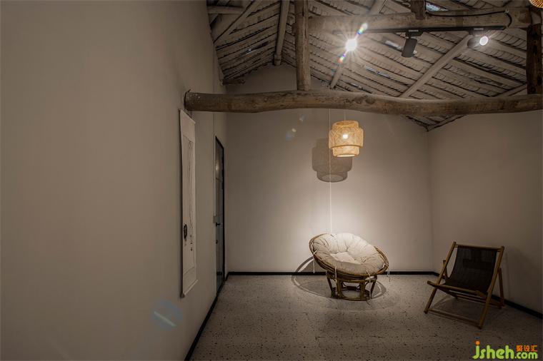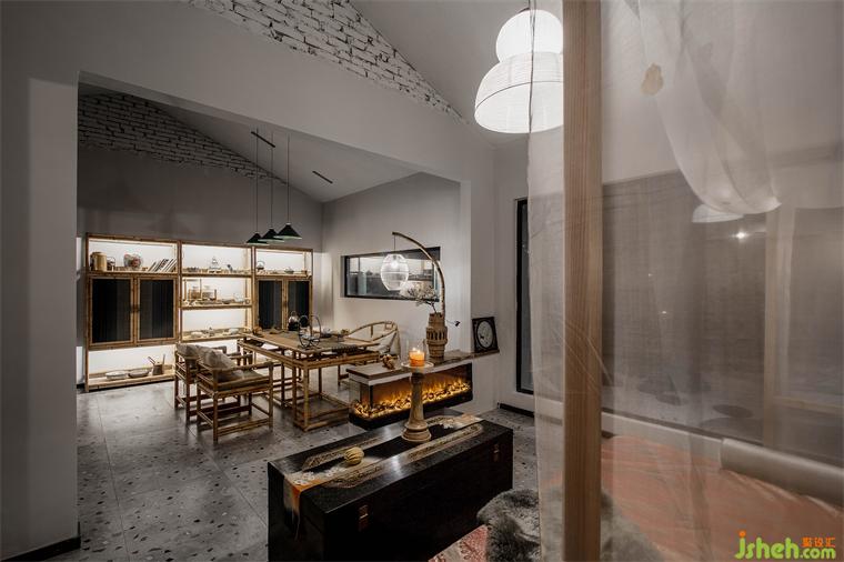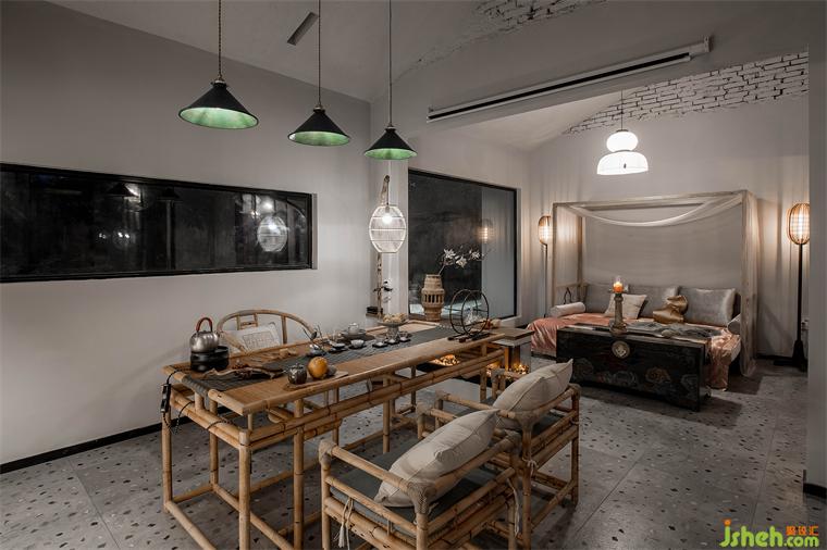 舊房改造設(shè)計(jì)以茶桌前景,以帶紗幔的禪床為遠(yuǎn)景的主客廳布置。