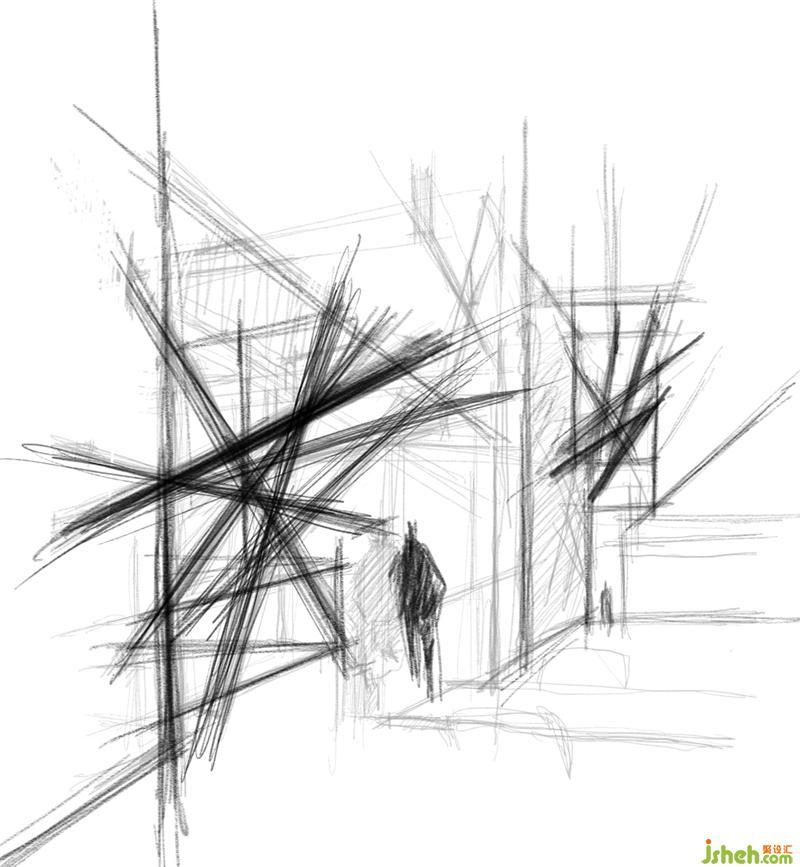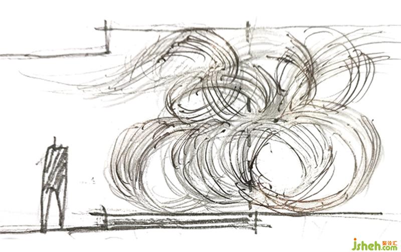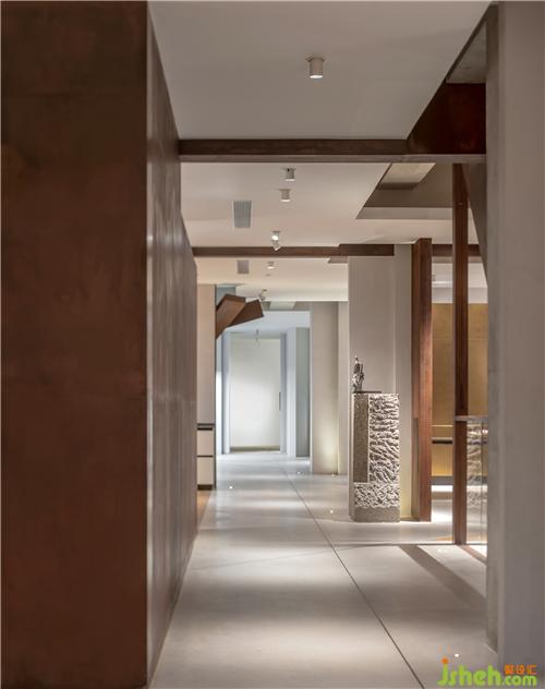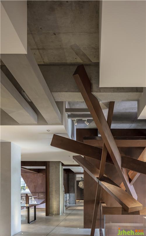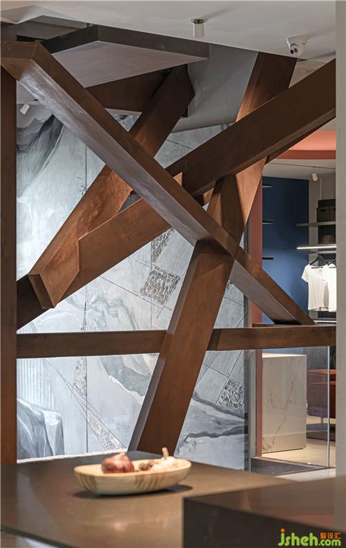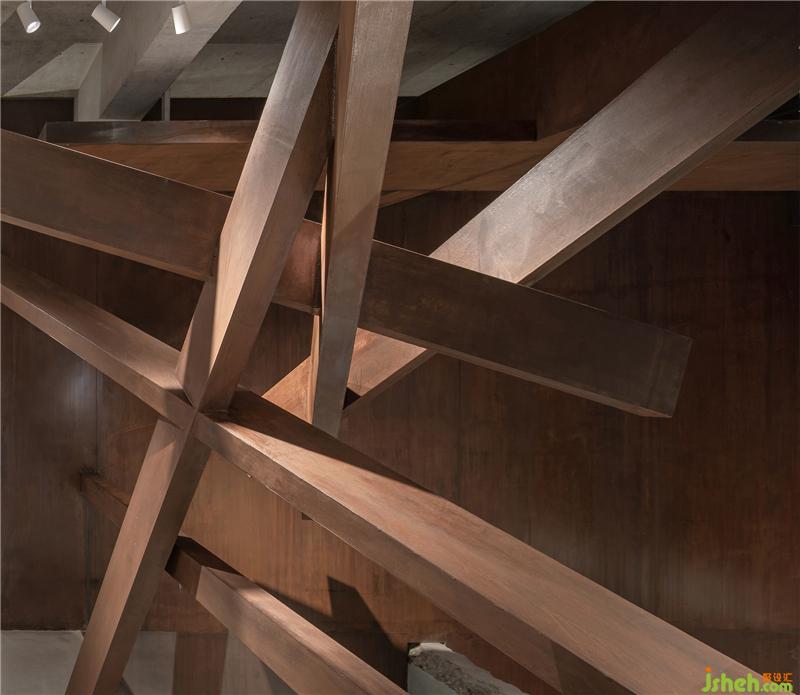利用構(gòu)架和剪紙塑造出來的空間總是感覺缺乏一些內(nèi)容;似乎顯得過分理性了,繼而沿用銹板材質(zhì)設(shè)計一個自由交叉的線性裝置,使空間的構(gòu)成更具有靈動性。