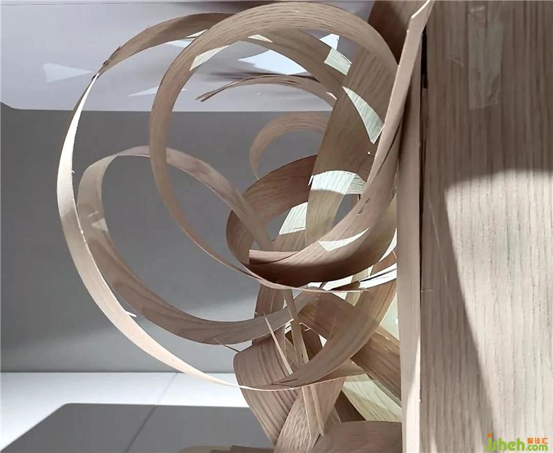 蘇州總是讓人不由自主地想到人文傳統(tǒng)、精致生活,意識里第一時間跳入我腦海中的是竹的編織元素。通過藝術(shù)團隊反復推敲,凌亂的線條裝置;如草書的飄逸砂筆,又或許是秋野中的一堆干稻草,自然而親切,點綴和柔化了空間。展廳設(shè)計