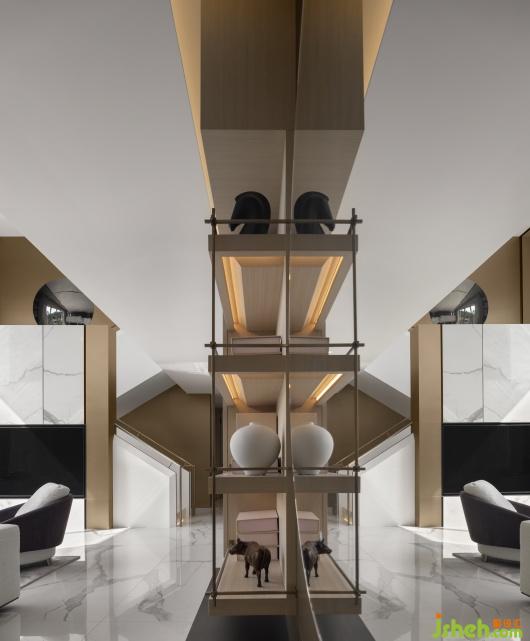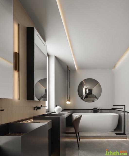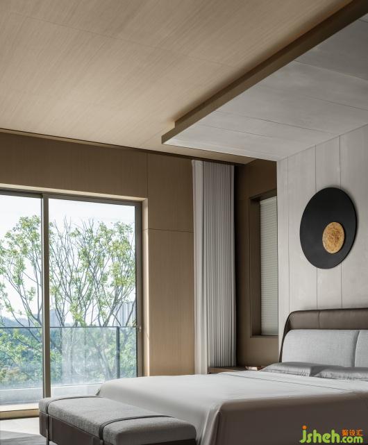 別墅設計主臥柔和的淺灰色墻面搭配木質(zhì)面板,床頭背景的藝術設計營造出寧靜舒適的睡眠環(huán)境,讓人感受到一種內(nèi)心的安寧。臥室將功能性與奢華感完美融合想象在這里,夜晚的星空透過大面積落地窗投射進來,伴隨著窗外的微風,讓人沉浸于自然與舒適之中。臥室內(nèi)設有獨立的步入式衣帽間和寬敞衛(wèi)浴,空間的巧妙分隔為生活提供了更多隱私,現(xiàn)代簡約的浴缸與大理石臺面相得益彰,為心靈提供了一個靜謐的港灣。