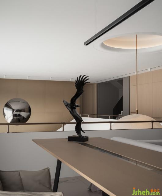餐廳與開放空間緊密銜接,完美呈現(xiàn)了當代輕奢主義的優(yōu)雅與簡潔。餐桌是整個家庭的核心,它不僅是日常用餐的中心,也是家人相聚的紐帶,承載著溫馨的家庭時光。特別是圓桌的設計,不僅具有極高的功能性,能夠輕松容納全家人共餐,還在家庭聚會中拉近了彼此的距離,增進了親密感。在燈光設計上,簡約的吊燈懸掛于餐桌正上方,細致的線條勾勒出空間的層次與高度,柔和的光線與整個空間的輕奢氛圍相得益彰。尤其是在燭光晚餐時,燈光散發(fā)出的溫暖,進一步強化了空間的親密感與情感聯(lián)結。