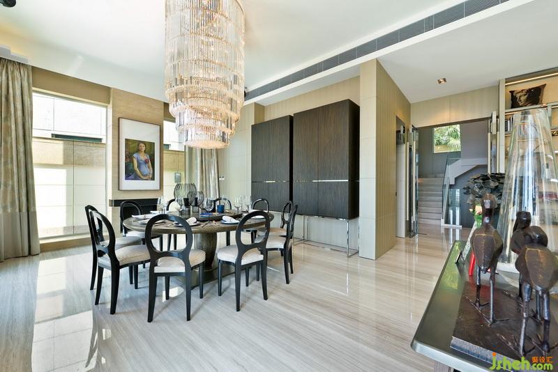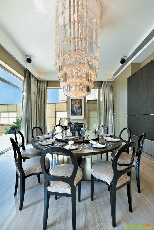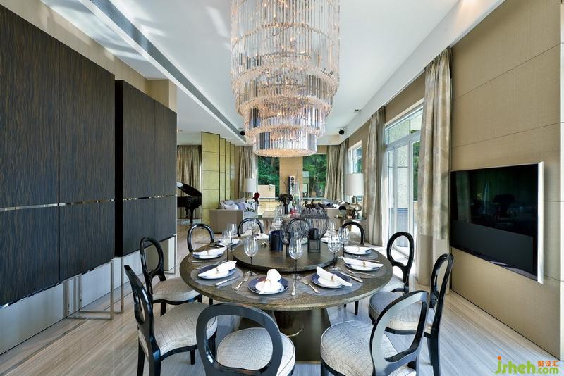 水晶吊燈垂落而下,光彩琉璃,構(gòu)成餐廳的焦點(diǎn)。圍合式的餐桌溫馨家常,左側(cè)是實(shí)用性極強(qiáng)的收納立柜,右側(cè)則為電視墻,萬(wàn)家燈火時(shí),一家人其樂(lè)融融相聚在此,共享團(tuán)圓之樂(lè)。