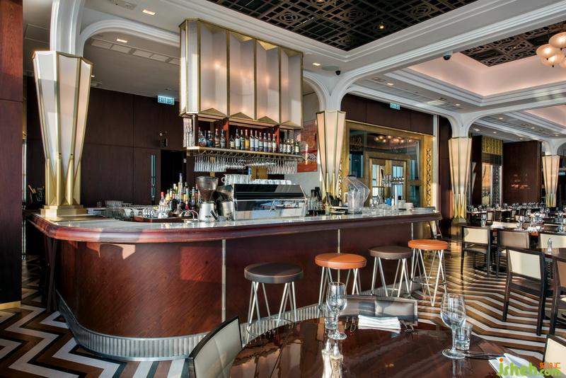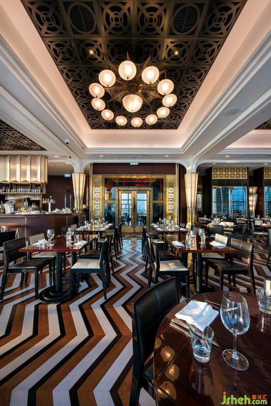 6,000呎的超大空間和落地窗的大面積使用,令空間平坦如鏡,一覽無(wú)余。就餐區(qū)的每一處細(xì)節(jié),也將“裝飾風(fēng)藝術(shù)”貫徹到了極致。菱形沙漏狀的落地?zé)艟赖梅路鹧b置藝術(shù),與吧臺(tái)頂燈一脈相承的同時(shí),又令玻璃酒盞籠罩在流光溢彩中。