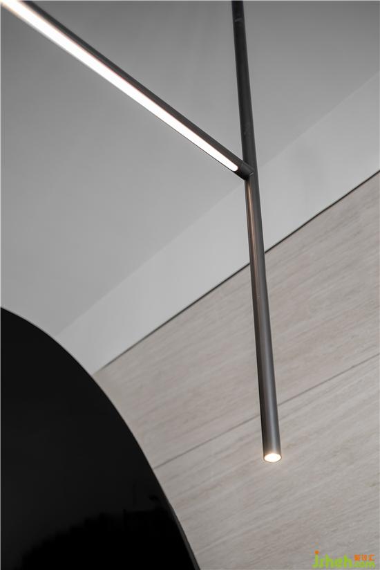 對(duì)開放大空間的改造檢驗(yàn)的是設(shè)計(jì)師對(duì)區(qū)域空間劃分的能力,通過對(duì)色塊的使用、建材的選擇、場景的搭建和一些創(chuàng)造性的搭配讓空間層次富和起來,讓身處其中的人與環(huán)境融入,心生踏實(shí)的歸屬感。在這個(gè)案子里,這一手法的運(yùn)用被體現(xiàn)的淋漓盡致。進(jìn)門處,一排到頂?shù)暮谏举|(zhì)背景架占滿左手墻壁,密密麻麻的置物格將墻體切割成無數(shù)黑色方塊,空間感十足,散發(fā)出金屬質(zhì)感;而在背景架中層填充書籍和飾品的設(shè)計(jì)既迎合了視覺需求,讓所過之處并不是空無一物,又有效中和了大面積深色墻體給人造成的壓迫感。這一區(qū)域的點(diǎn)睛之筆絕對(duì)要數(shù)燈光的運(yùn)用,從左至右、由上而下垂直相交于右側(cè)空中的金屬管造型的燈品造型(同樣的燈飾造型在洽談區(qū)也得到了沿用),用工業(yè)管道的連接式造型替代傳統(tǒng)的吊燈形象,仿佛下一秒從燈管中傾瀉而出的不僅是淡雅溫潤的光,還有麥香濃郁的酒;在光影之下,空間也自然被分割成明暗兩區(qū)(左側(cè)黑色背景柜和右側(cè)淡色云紋墻面),而過渡、連接的燈光設(shè)計(jì)又讓視覺與空間的割裂愈發(fā)柔和模糊起來,在視覺效果和空間層次上得以豐富。接待中心設(shè)計(jì)