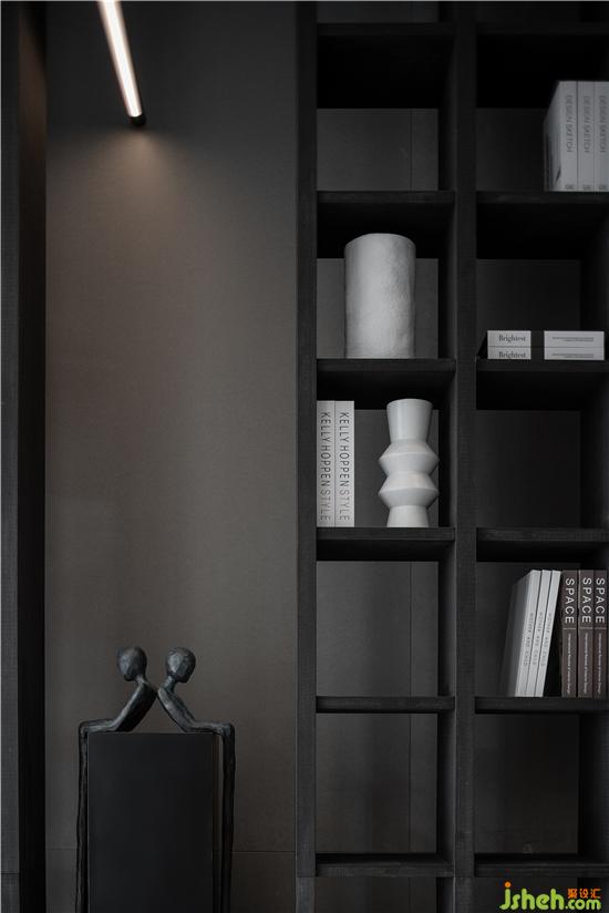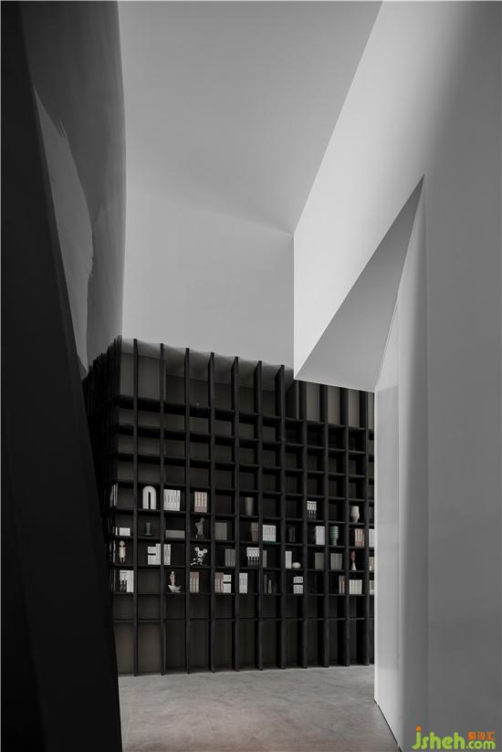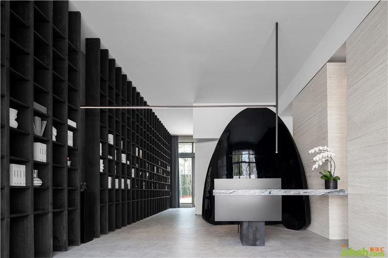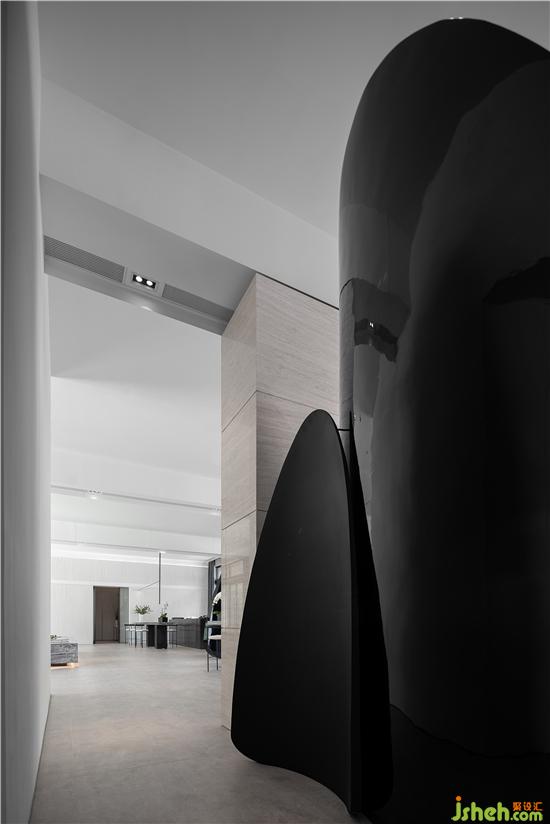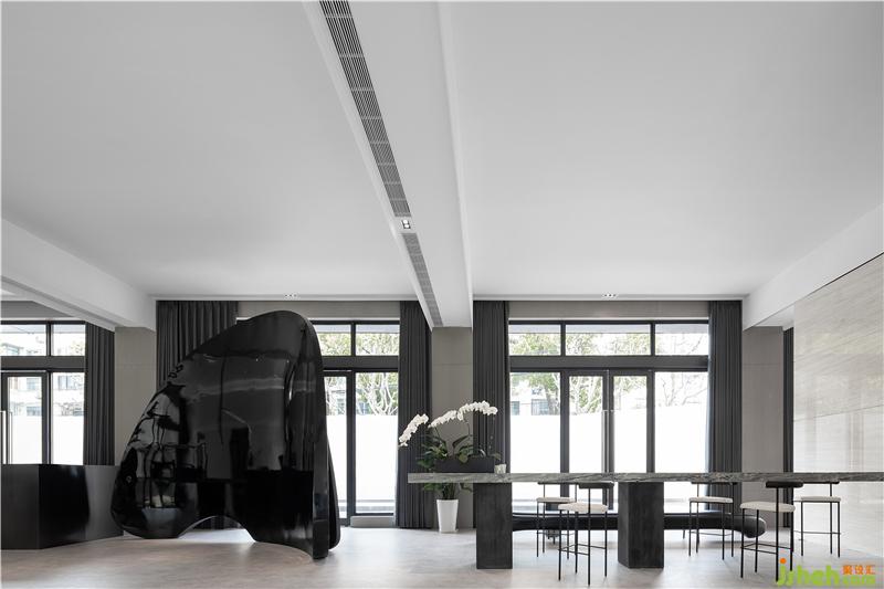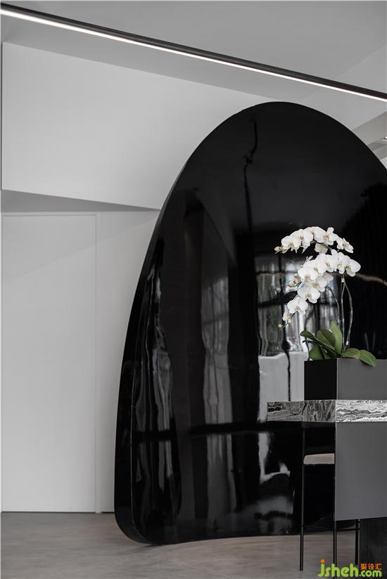 為了實(shí)現(xiàn)區(qū)域功能劃分,突出空間私密性,設(shè)計(jì)師在空間中用一組組由鋼材面噴光啞漆制成的、大小不一的黑色巨型擺件作出了分區(qū)設(shè)計(jì),這些被戲稱為“薯片”的黑色藝術(shù)品由鄭炳坤先生親自設(shè)計(jì)監(jiān)制,每一片都呈現(xiàn)底部厚頂部薄的漸變形態(tài),而噴光與啞漆的涂面的設(shè)計(jì)也讓擺件隨著室外光線的明暗變幻映射出流動(dòng)的光暈,不僅回避了笨重、呆板的觀感,整個(gè)空間也隨著它的流線外形一起雋永了起來。