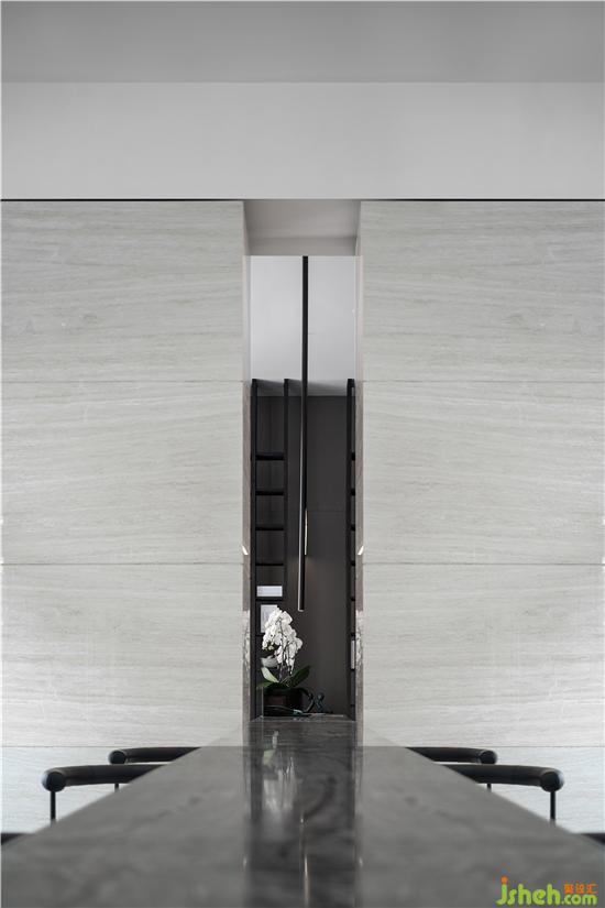 從外觀來看,與其說是接待中心,更像是美術(shù)館、圖書館或博物館的形制??逃屑?xì)膩紋路的白色墻圍與黑磚打底的深色水池如同兩道色差鮮明、角度銳利的線條,勾勒出建筑的外部輪廓;架設(shè)于深色水池之上的白色甬道如同一個(gè)內(nèi)嵌的環(huán)形一路引向主體建筑正門,在事實(shí)上將水景一撥為二的同時(shí),又一次用黑白色差給人以視覺上的刺激,讓來訪者有漫步水上的靈動(dòng)想象和真實(shí)觸感。