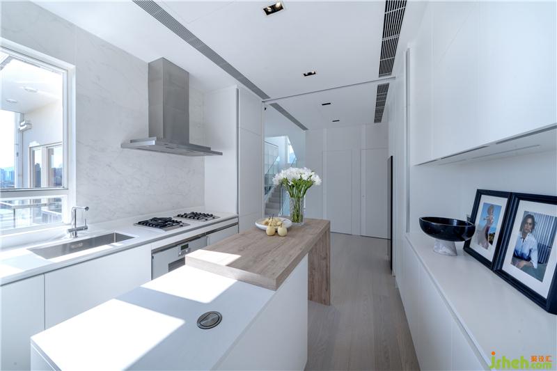 先看動(dòng)區(qū),入門處,白色玄關(guān)左側(cè)是廚房和傭人房,右側(cè)是客廳。廚房采用了半開放式設(shè)計(jì),西廚中島就像變形金剛一樣好用,滿足了屋主對(duì)于料理、收納、輕餐、社交,甚至拆快遞箱,所有對(duì)于廚房的功能想象。在廚房?jī)?nèi)部就是傭人房,并配套有衛(wèi)生間、洗衣房。在這里需要提出表?yè)P(yáng)的是,設(shè)計(jì)師考慮到全屋的動(dòng)線流暢和功能銜接,為廚房設(shè)計(jì)了雙動(dòng)線(入門玄關(guān)一條線,客廳一條線),避免了傭人買菜、曬衣經(jīng)過客廳的尷尬,做到了兩個(gè)空間的既相互連同又互不干擾。