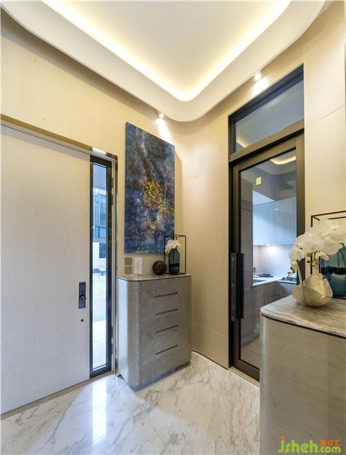 入戶門廳是大小適中的四方形制,圓角藻井吊頂與氛圍柔和的漸進(jìn)照明為主人歸家營造溫馨暖意。分立兩側(cè)的銀色雀眼木玄關(guān)桶柜,不僅滿足出門入戶的收納需求,香港別墅裝飾還為主人含蓄端莊的藝術(shù)花樽與奔放獵奇的油墨掛畫提供托舉,如此體貼入微的空間情緒設(shè)計(jì),怕是連買餸做飯都能洋溢起對(duì)美好生活的無限向往。不僅如此,從門廳為起點(diǎn)的功能分區(qū)與動(dòng)線安排亦可見出設(shè)計(jì)師的真心誠意:廚房和保姆房規(guī)劃在同一區(qū)域,保證了保姆日常家務(wù)動(dòng)線與生活動(dòng)線的高效統(tǒng)一,避免了“穿堂過屋”的尷尬,不打擾屋主一家起居休閑的安靜私密;而隱藏于玄關(guān)過道墻體內(nèi)的化妝間,不僅有效利用了角落面積,更功能性的滿足了一層公共區(qū)域的使用需求,讓回家清潔和出門補(bǔ)妝成為隱蔽空間里的舉手之勞。