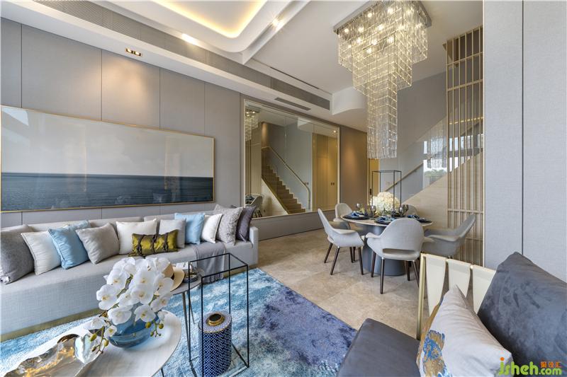 繼續(xù)向前,中式原木鏤空格柵將動(dòng)區(qū)與通往靜區(qū)的樓梯進(jìn)行物理分割。轉(zhuǎn)過身來,長(zhǎng)達(dá)2米的水晶吊燈如水銀瀉地,既呼應(yīng)了3米5挑高的尺度,讓空間在維度上瞬間拉滿;又借景戶外,拉近房屋內(nèi)外的親密關(guān)系,讓視覺在層次上極大豐富??蛷d墻面整塊的白色云石巖板與地面滿鋪的藍(lán)色墨染地毯隔空呼應(yīng)、各領(lǐng)風(fēng)騷,在自然的石材紋理與手工的織物質(zhì)感間勾勒出山的綿延和水的婉轉(zhuǎn)。優(yōu)雅拙樸的莫蘭迪色系沙發(fā),與黃銅桌腳、大理石臺(tái)面的組合茶幾合圍布局,搭配金屬質(zhì)感強(qiáng)烈的藝術(shù)擺件,任由海天藍(lán)白掛畫的從中調(diào)和,在無主燈設(shè)計(jì)的氛圍照明中,讓日常生活從肌理處溢出高雅品味,并不忘加持一份于無聲處的隨性灑脫。