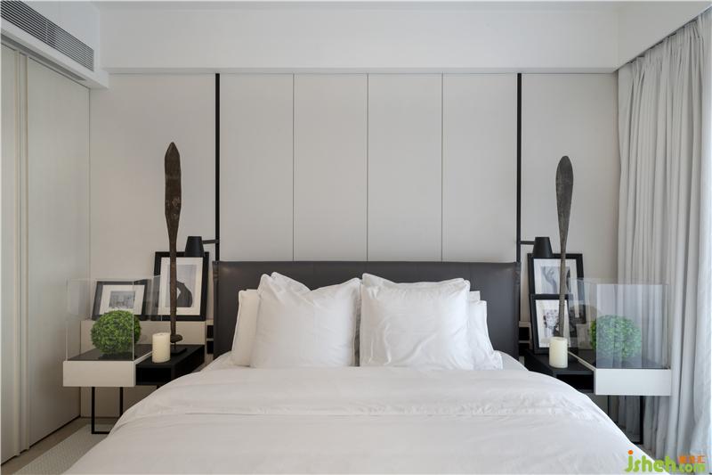 拾級而上,整個樓層都被規(guī)劃為靜區(qū),八百平尺、三室兩衛(wèi)和全臥室采光使得一家人的休憩獨處安逸從容、不受攪擾。通觀靜區(qū)的結構布局與裝潢陳設,以主臥室為例,依然是素雅的白色打底,依然是無主燈的氛圍照明,黑色的線型條燈和C型落地燈,點綴以床頭蔥郁的渾圓花球,處處體現(xiàn)著與樓下動區(qū)的細節(jié)統(tǒng)一;而電視柜下不規(guī)則的原木支腳“喊話”床頭頗具異域風情的槳狀紅木擺件,與代表現(xiàn)代的印刷品和彰顯后現(xiàn)代的藝術畫混搭沖撞在一起,也揭示了屋主向往生活與藝術相互涵養(yǎng)、浸潤的詩意敘事和精神追求。