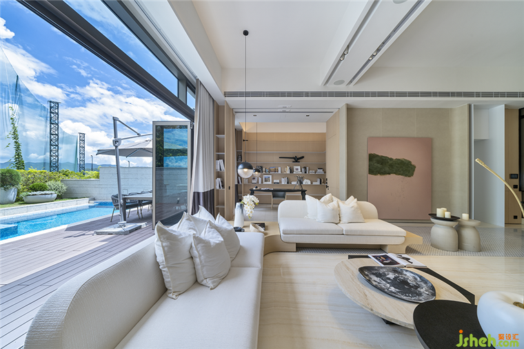趟折式玻璃幕門連接逾千呎的大花園,私享七米長的大泳池,與自然建立起聯(lián)系與互動,室內(nèi)外貫通,光影自由穿梭,空間感更加舒坦,花園成為房屋自然的延伸,視線也因此愈加滲透。