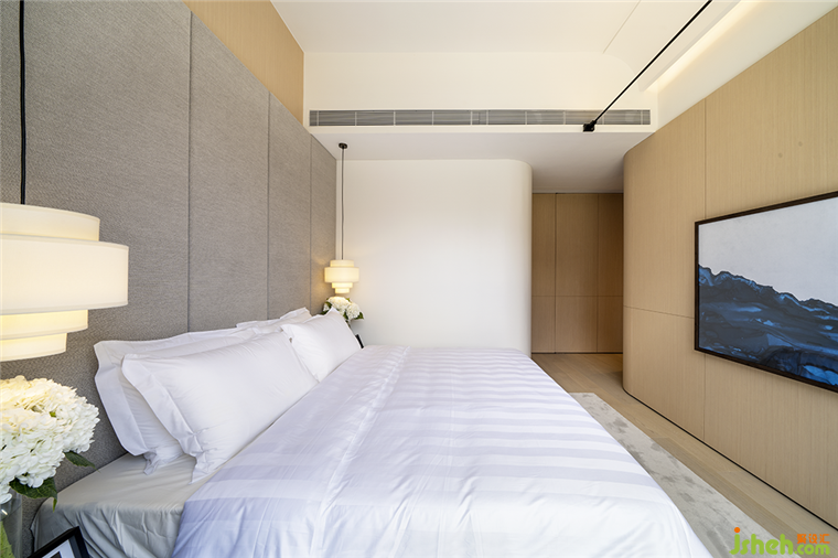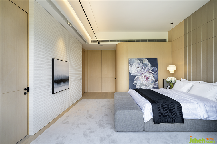 一盞白色薄片金屬整齊排列的吊燈以優(yōu)雅別致的魅力成為餐廳主角;別墅裝修設(shè)計(jì)車線卡其色人造皮及淺色木飾面的大面積導(dǎo)入,盡顯溫暖簡約的居住氛圍。