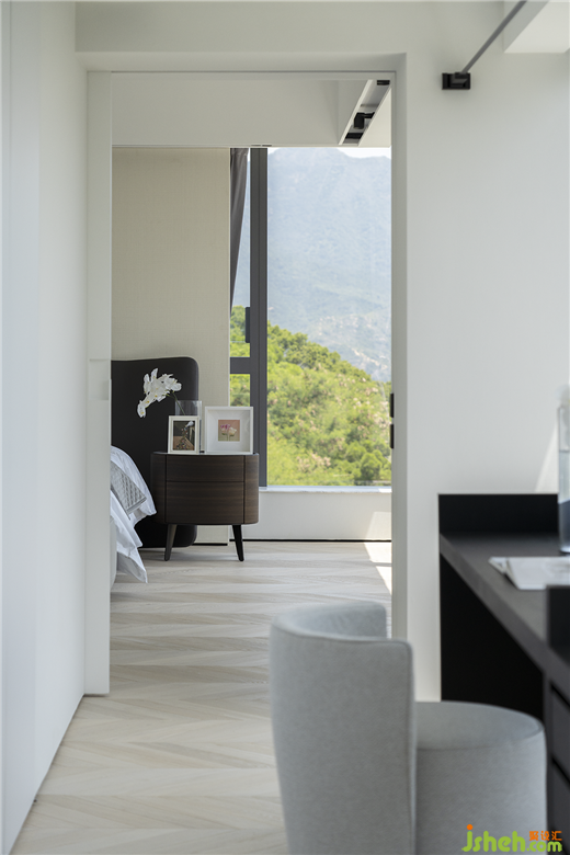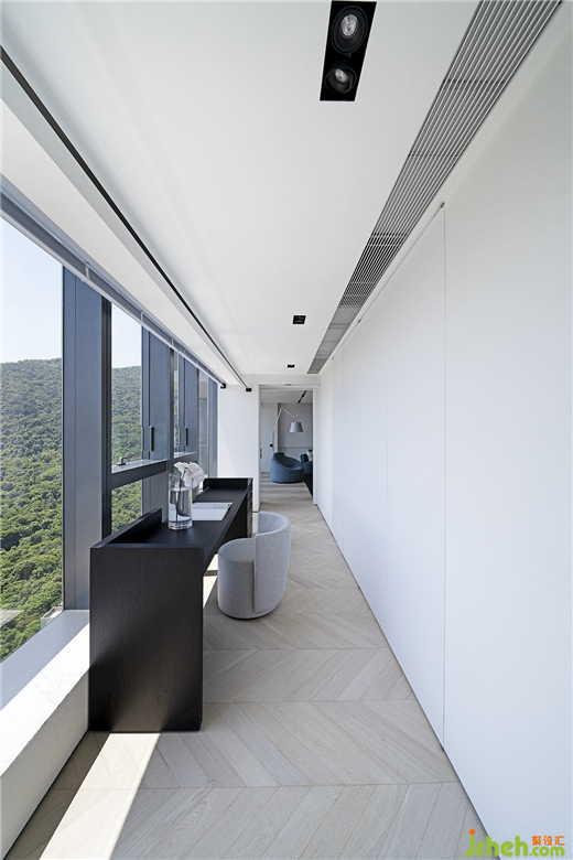 留白的空間看似不具備功能性,實則是一種平衡感的塑造。香港私宅設(shè)計通往主臥的長過道,設(shè)置了一套黑色書桌,自然形成了半隔斷緩沖場景,視野隨著玻璃窗向外延展,充滿生命力的自然之美無處不在。