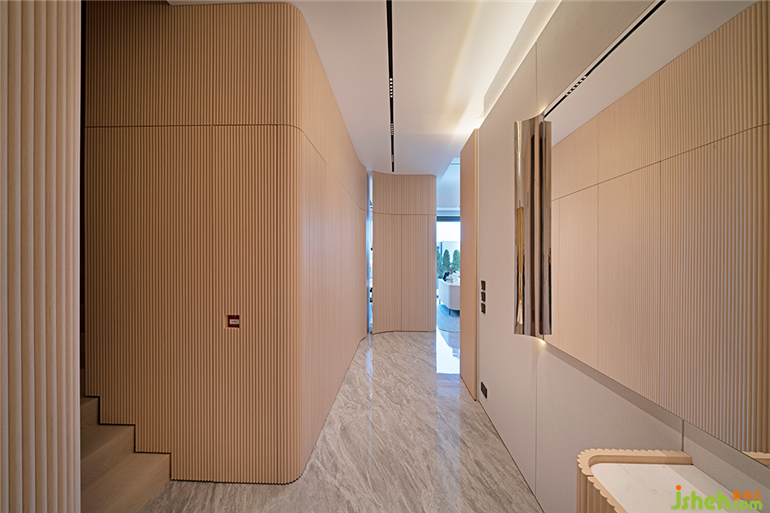 香港駿嶺薈私宅設(shè)計(jì)的首層設(shè)置為公共區(qū)域。從歸家的電梯入戶后的走廊和玄關(guān)的精心布置開(kāi)啟:半開(kāi)半合的設(shè)計(jì)兼具空間功能分區(qū)與完善的收納體系。緩緩走入,漸漸卸下平日里快節(jié)奏高強(qiáng)度的身心狀態(tài),輕盈地進(jìn)入屬于自己的生活容器。