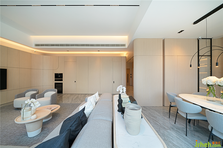 消隱的墻體隔斷,讓居住體驗(yàn)更為流動(dòng)與開(kāi)闊,開(kāi)合有序,香港駿嶺薈私宅設(shè)計(jì)大量的隱藏式柜體收納與生活電器的內(nèi)嵌設(shè)置,滿足實(shí)際生活應(yīng)有的功能性,空間更顯干凈簡(jiǎn)約,素樸大氣。