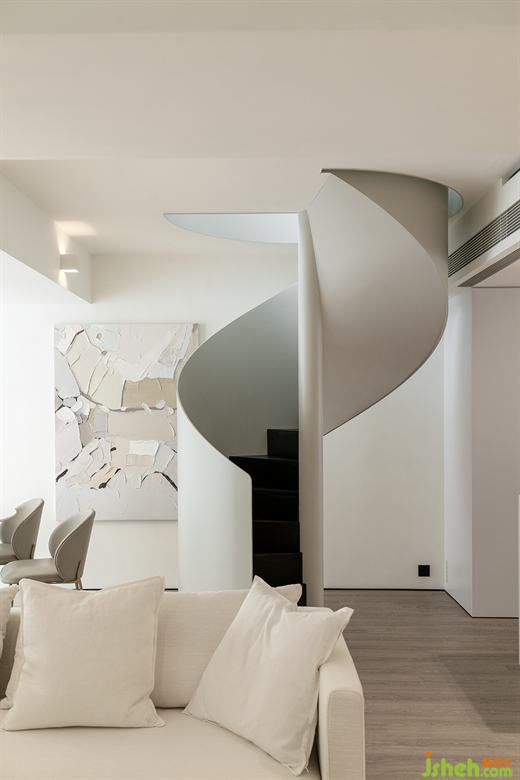 簡(jiǎn)約黑白造型的旋轉(zhuǎn)樓梯,優(yōu)美的弧線和極致工藝彷佛一件藝術(shù)品佇立于此,橫向和縱向點(diǎn)亮了每個(gè)留白的空間,其空間的生命張力令人驚喜,隱隱滲透著家的無(wú)窮力量。