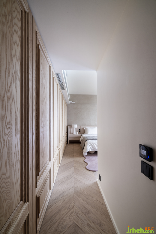 主臥套房,延續(xù)了客廳的木質(zhì)立面的溫潤感,以營造靜謐優(yōu)雅為空間基調(diào),素雅的床品潔凈舒適。低飽和度的空間色彩,讓窗外的開闊視野一覽無余,仿佛從喧囂的世界解脫出來,理想的生活場景此刻具象化了。