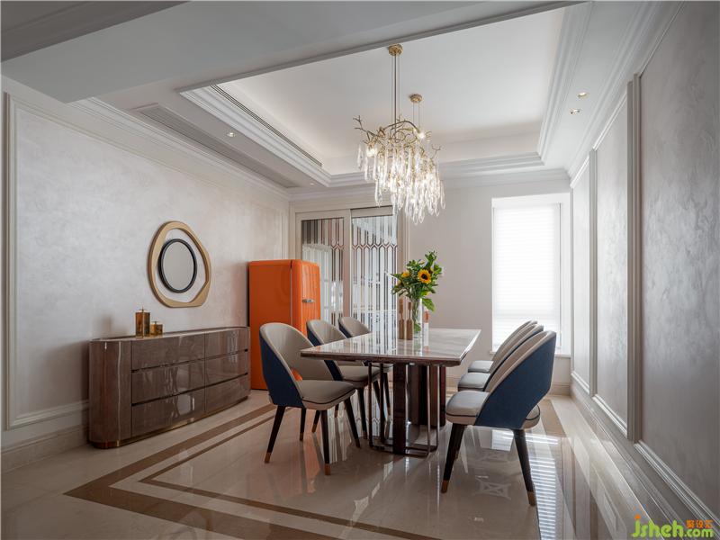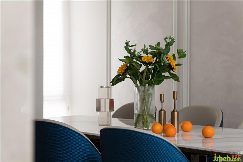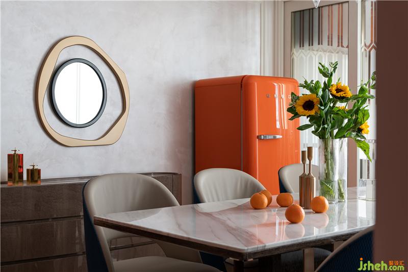 餐廳在延續(xù)空間主調(diào)的前提下,多了一絲純粹的意蘊。精心挑選的橙色冰箱與餐桌上清麗的花葉勾起饗食的欲念,古銅波紋裝飾鏡折射出靜謐和樂的空間氣質(zhì),空間是背景,陳設是前景,而中間則是生活本身,目光所及,春光明媚,生命美好。