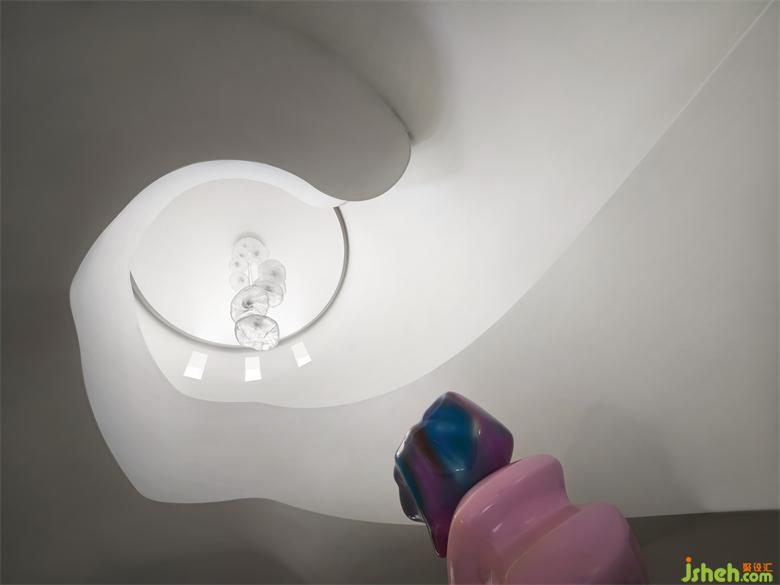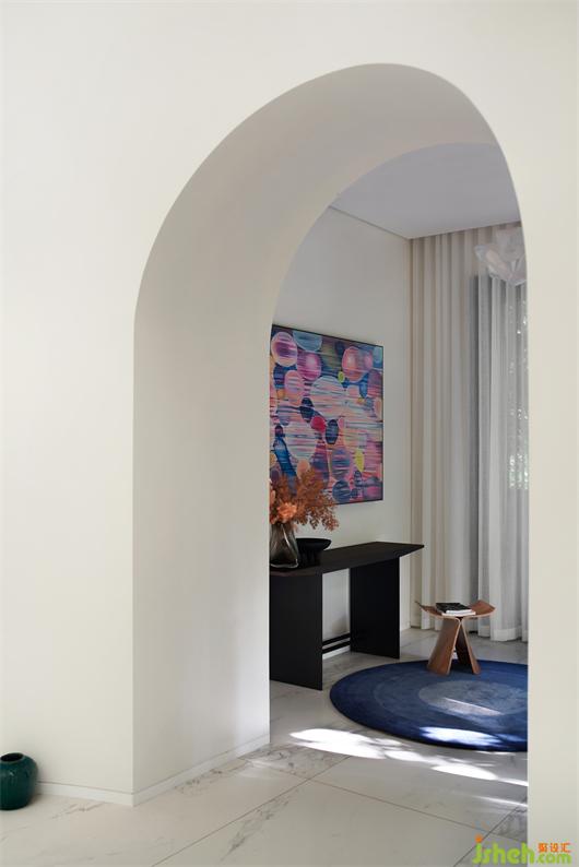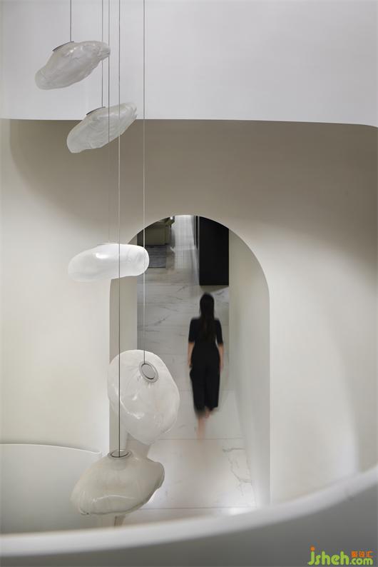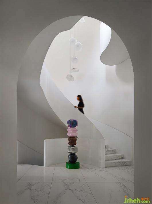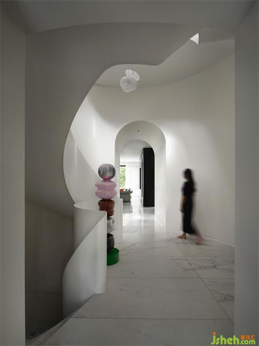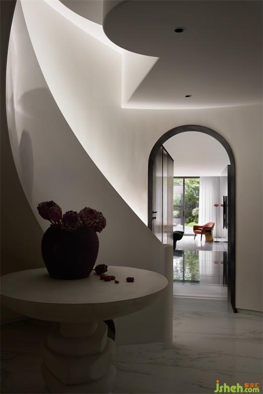 別墅設(shè)計(jì)以純潔的白色為空間底色,貫穿空間的弧形的線條就如自然生長(zhǎng)一般,在日光的漫射下,光的神奇力量讓一種難以言喻的奇妙氛圍呼之欲出,一個(gè)圣潔的場(chǎng)域呈現(xiàn)于你眼前。