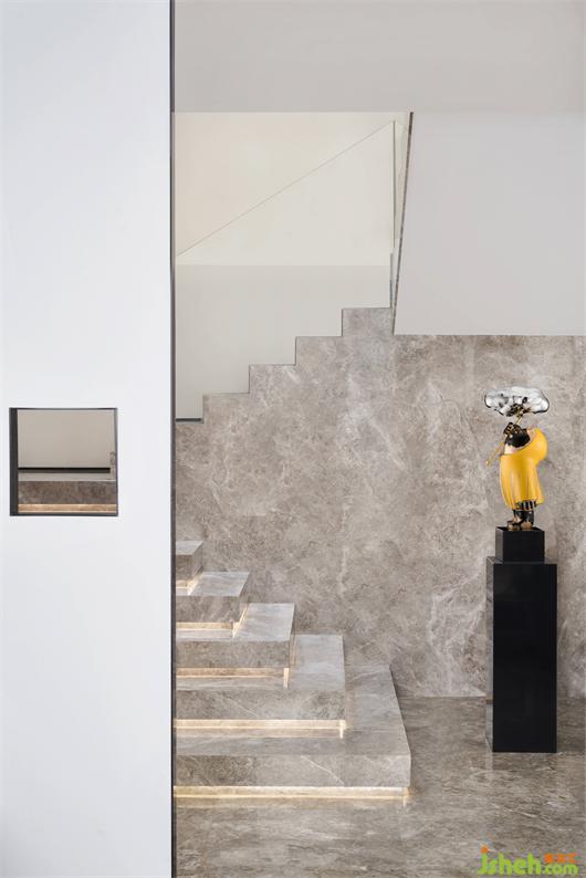 搭配暖咖色的石材紋理和階梯燈光的交織