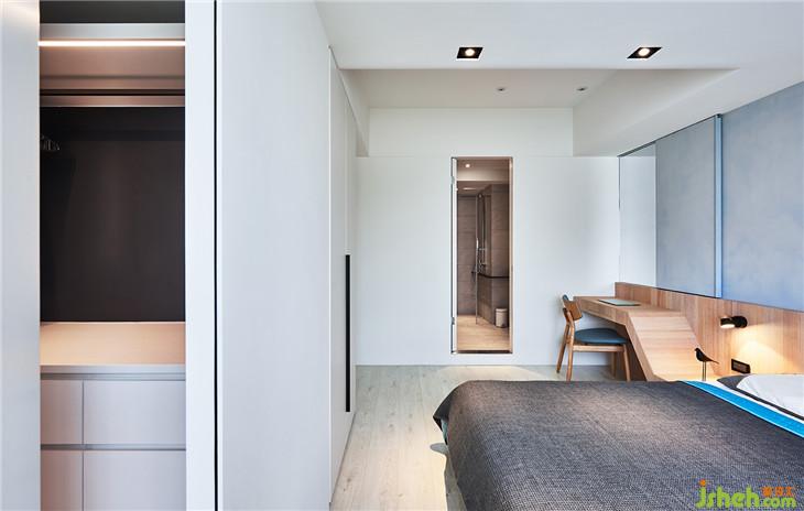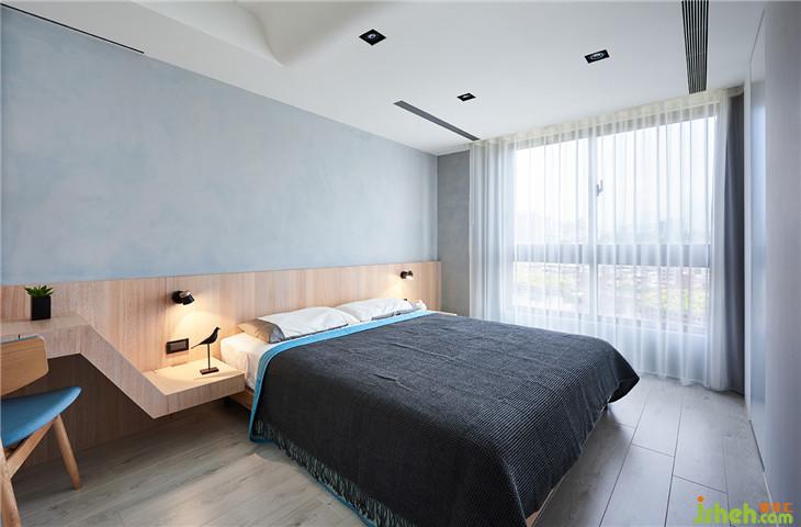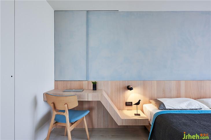 主臥床頭墻面,也是硅藻土材質(zhì)調(diào)成藍(lán)色,墻面也隱藏一個(gè)拉門,拉開底下就是鏡子功能。