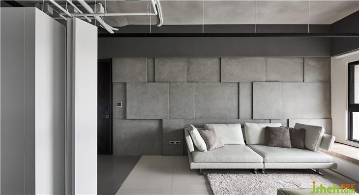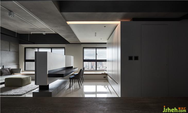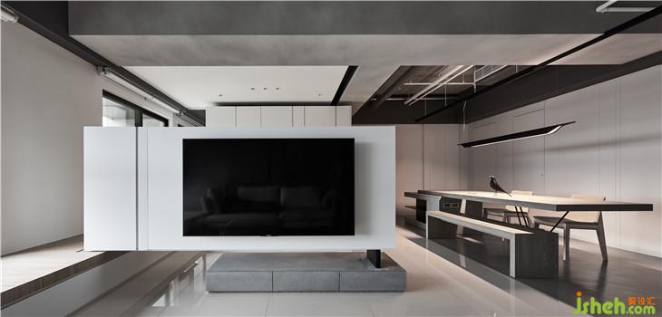 因為屋主很好客,所以我們讓這空間的主要核心就是中島,利用地坪界定兩個區(qū)塊,灰色無縫地坪隱涵著土地從入口延伸到餐廳,透過皺褶的鐵件縫隙隱約看見土地上長出的中島,區(qū)隔的白色磁磚面地坪象征水的意象,電視像是墻懸空在水面上的量體