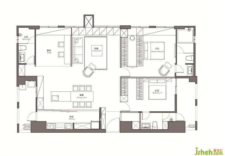 從書房往廚房看,餐廳用中島嶼實(shí)木活動餐桌的結(jié)合,變成一個(gè)可以寬廣的用餐空間