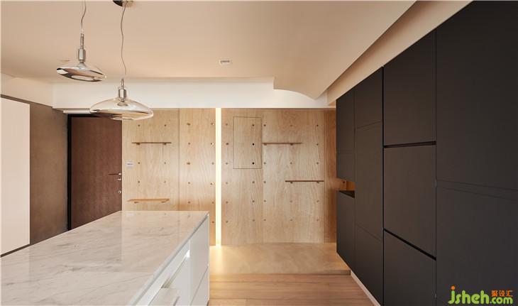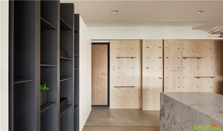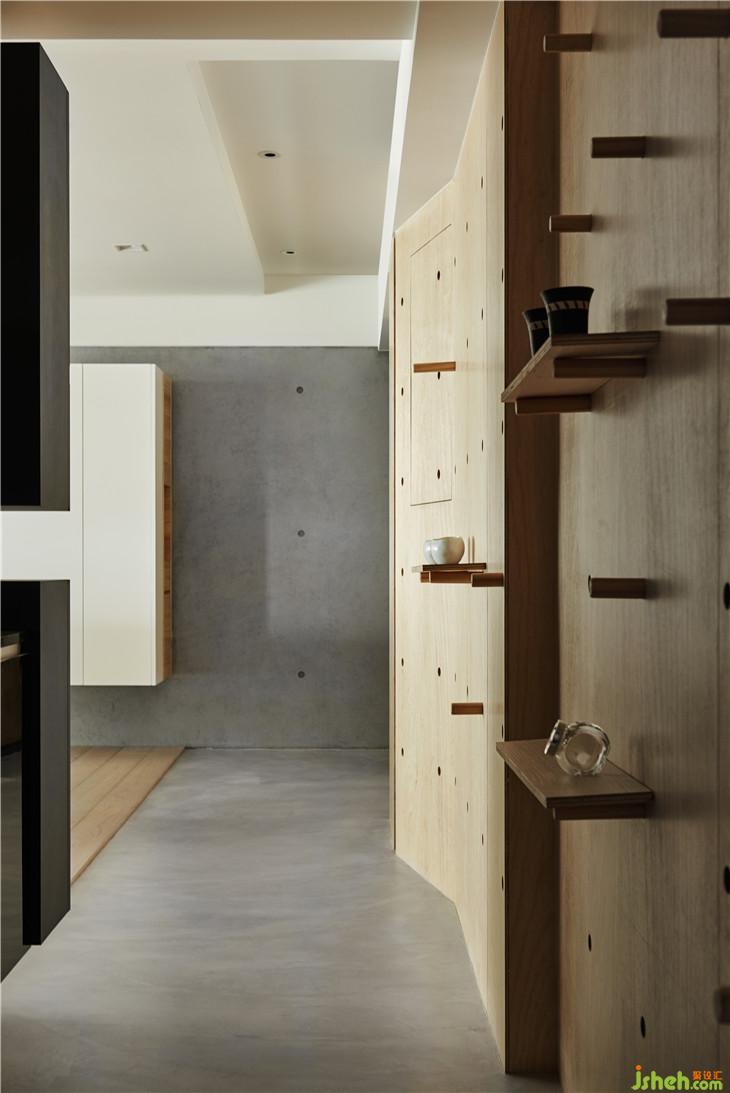 入口玄關(guān)是用特殊地坪涂料作為落塵區(qū)的空間區(qū)隔,剛好也利用材質(zhì)延伸到廚房 墻面也使用原有不加修飾的夾板修飾,設(shè)計成洞洞展示墻面,可隨不同心情變化展示方式