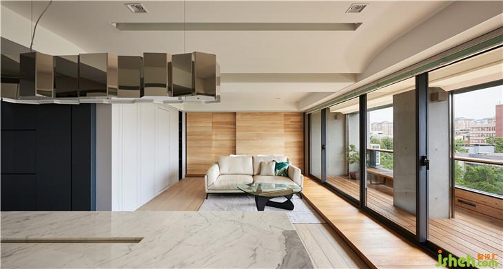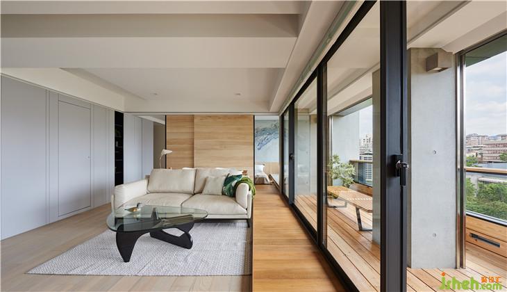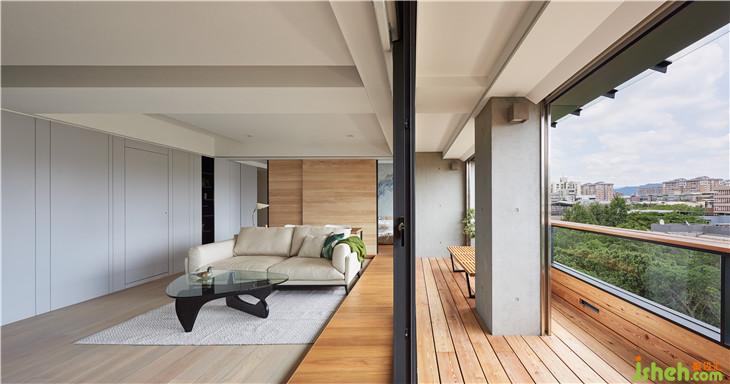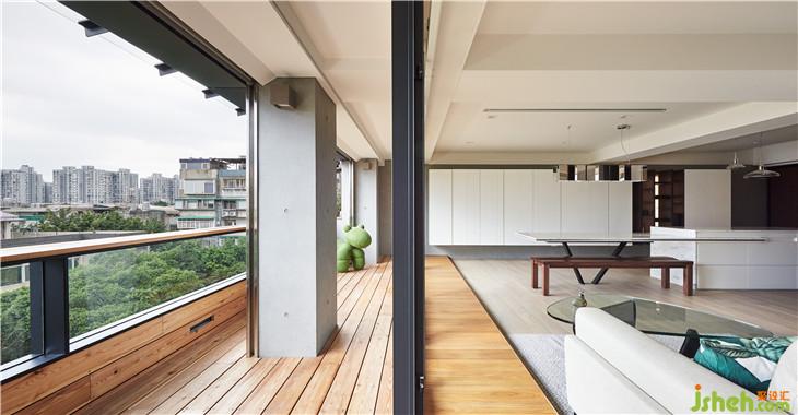 我們刻意內(nèi)縮的陽臺,也利用架高地板延伸到室內(nèi),壓低的陽臺扶手,也將外面樹叢帶入室內(nèi)