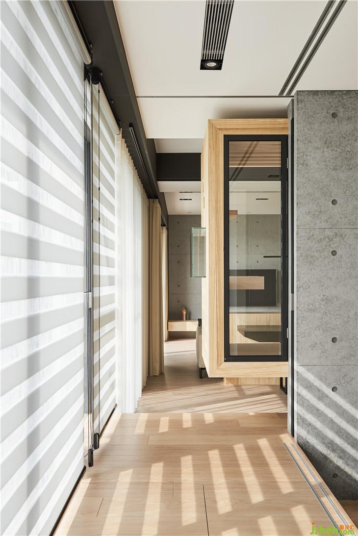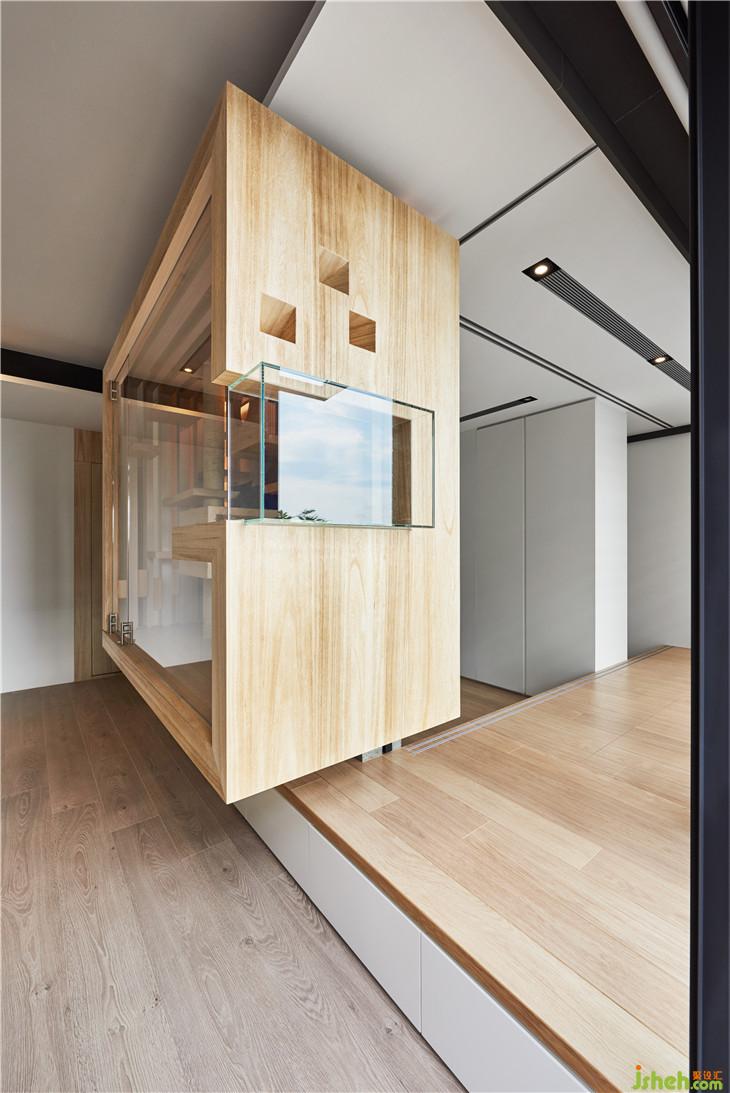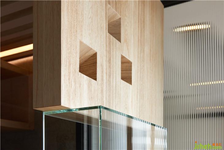 盒子內(nèi)的天花與側(cè)邊利用實(shí)木格柵設(shè)計(jì), 透光兼具透氣效果