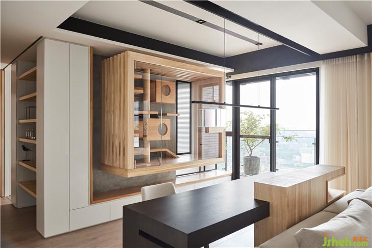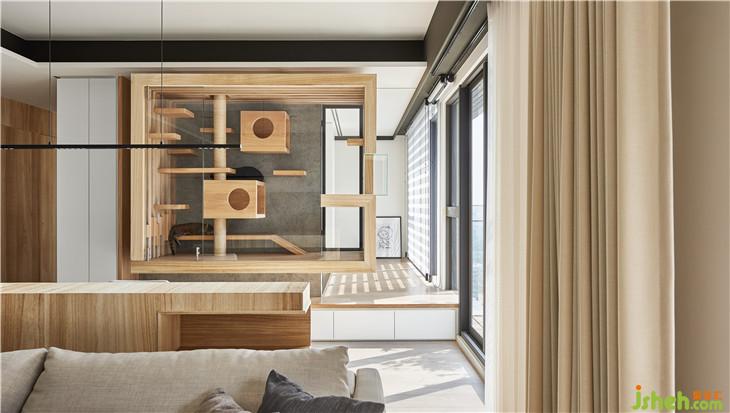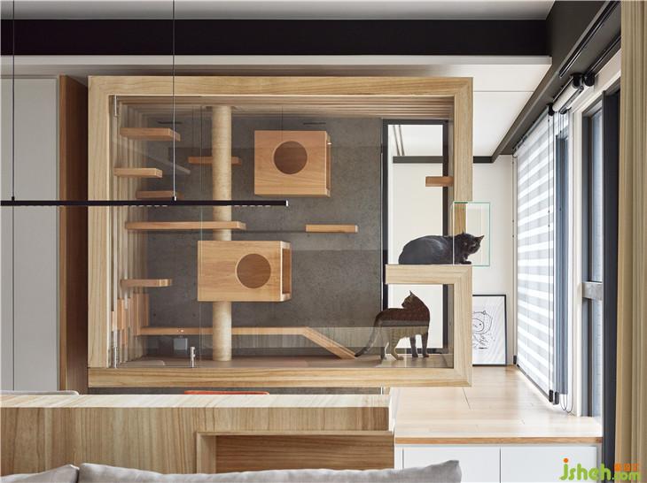懸空的貓屋量體,是貓界的小豪宅,刻意在窗戶開個(gè)觀景平臺(tái)面對(duì)千萬高樓窗景