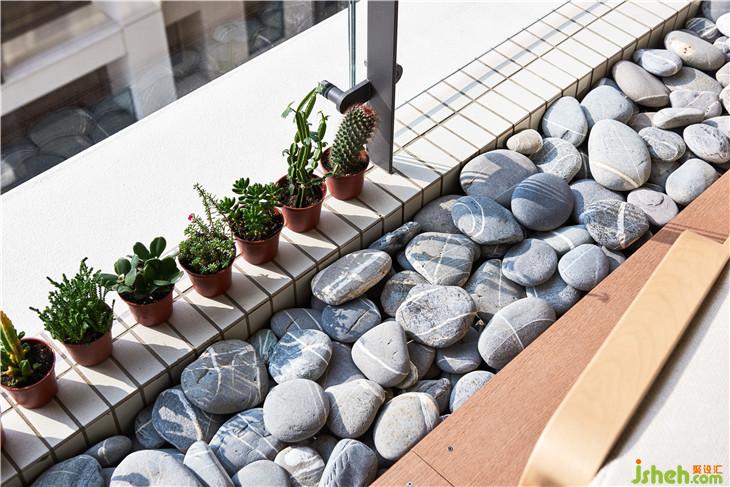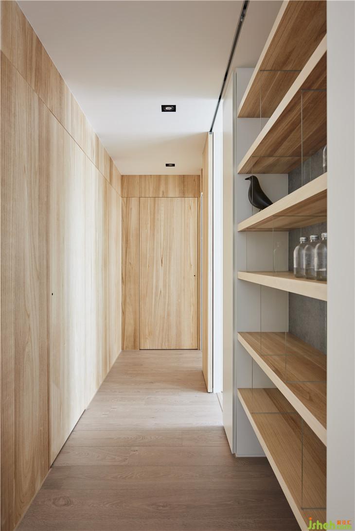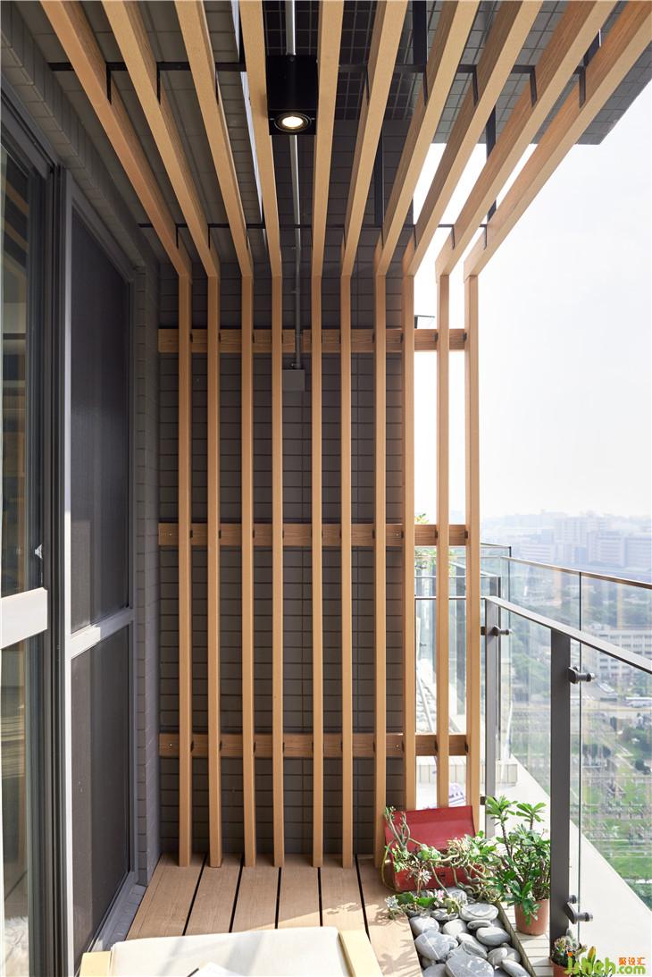 方陽(yáng)臺(tái)我們也使用塑木鋪設(shè)塑造休閑感,高樓層的好視野,塑木延伸至墻面及天花的設(shè)計(jì)