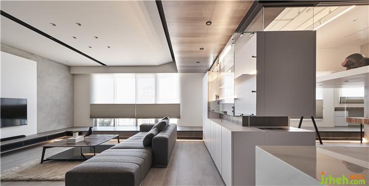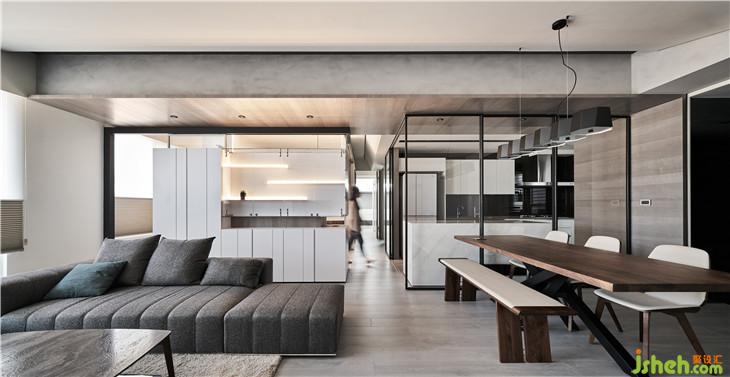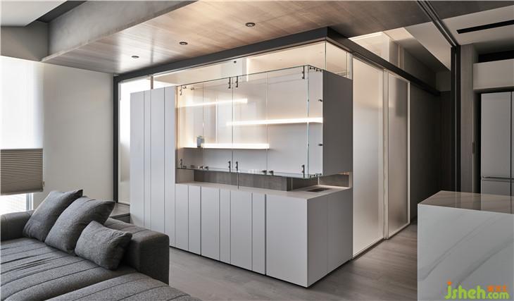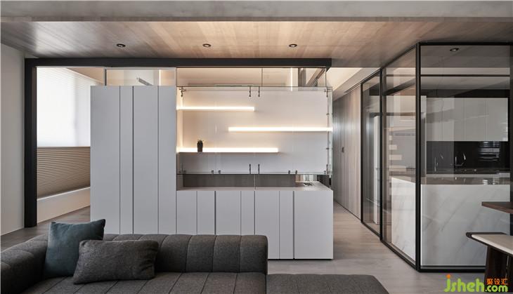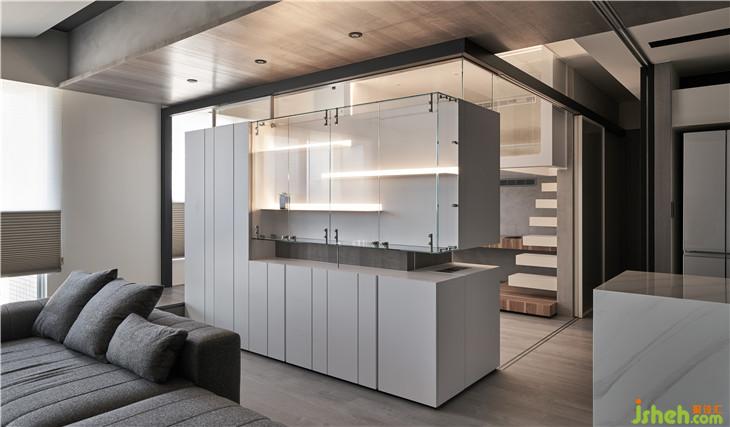 從客廳隱約看見前方展示柜量體后面的玻璃盒子,透過這樣的置入一個(gè)盒子的手法,改變了對于生活視角的想像,產(chǎn)生了看與被看的生活趣味。